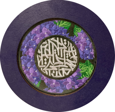 На изображении круглый декоративный элемент. В центре находится сложный узор, выполненный в виде каллиграфии. Около узора изображены цветы фиолетового цвета и зеленые листья, обрамляющие композицию. Фон вокруг этих элементов тёмно-фиолетовый.