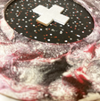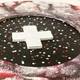 В его темном центре расположен белый крестовидный символ, окружённый кольцом из небольших точек разных цветов, включая красный, белый и чёрный. Внешний