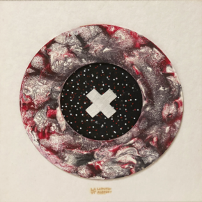 с использованием техник смешанных медиа. В центре находится большой круг, напоминающий мишень или цель.