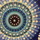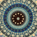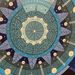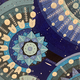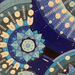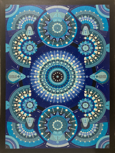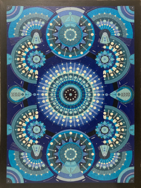На изображении представлена картина, выполненная в синих, голубых и белых тонах на черном фоне. Композиция состоит из множества стилизованных круглых элементов, расположенных симметрично.