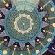 В центре картины находится самый крупный круг, содержащий множество концентрических окружностей с различными орнаментами, включая стилизованные деревья и точки. Вокруг этого центрального круга располагаются другие круги меньшего размера, тоже с узорами.