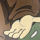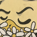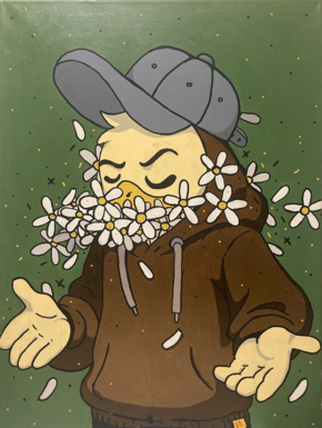 в коричневой толстовке с капюшоном и серой бейсболке. Утка изображена с закрытыми глазами, создавая безмятежное выражение. Вокруг лица и в области шеи персонажа изображено множество ромашек. Несколько лепестков ромашек парят в воздухе вокруг персонажа.