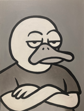 в мультяшном стиле. Фон картины серый, без каких-либо деталей.