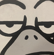 Персонаж имеет голову в форме слегка приплюснутого круга, окрашенную в светлый оттенок белого. У него крупные,