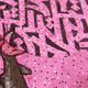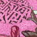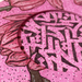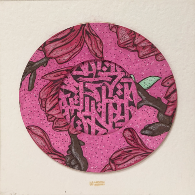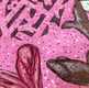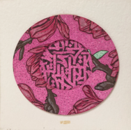 Изображение выглядит как круглая работа с ярко-розовым фоном, имеющим текстурированный, вкраплённый узор.