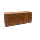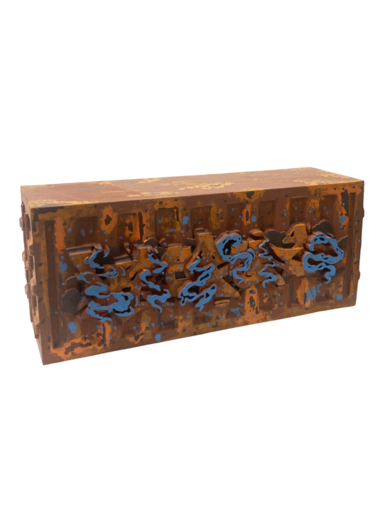 ржавый металлический блок с вырезанными формами, расположенными по горизонтали вдоль передней стороны.