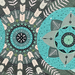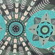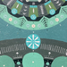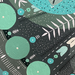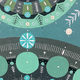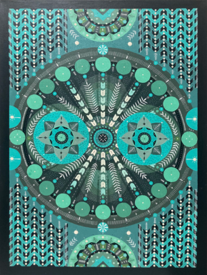 В центре картины расположен большой круг, внутри которого находятся два меньших круга, симметрично расположенных по горизонтали. Внутри этих малых кругов изображены стилизованные цветочные мотивы. Из центра круга расходятся элементы, напоминающие листья или стрелки, в различных оттенках зеленого и белого. Внутри и вокруг этих больших кругов расположены различные геометрические фигуры, включая круги, линии и точки.