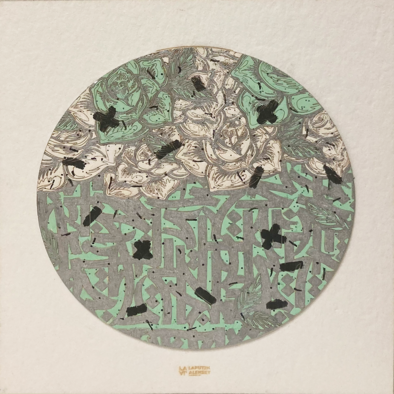 Центральным объектом изображения является круглый дизайн, заполненный замысловатыми узорами и текстом. Дизайн преимущественно выполнен в оттенках зелёного