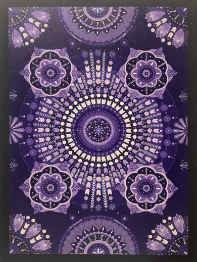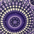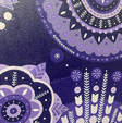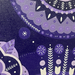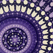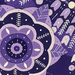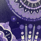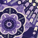 По углам и вверху и внизу от центральной мандалы расположены крупные цветочные мотивы с шестью лепестками, также выполненные в фиолетовых тонах. Вокруг этих цветов и между ними расположены другие круговые узоры и отдельные растительные элементы.
