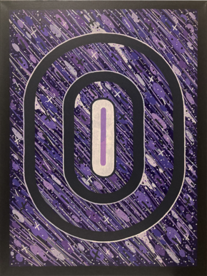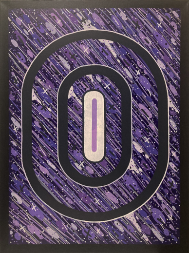 В центре композиции располагаются три концентрических овала темно-синего цвета, уменьшающихся в размере. В самом центре находится вертикальный прямоугольник с закругленными концами, выкрашенный в белый цвет с вертикальной полосой фиолетового цвета посередине. Картина заключена в черную рамку.