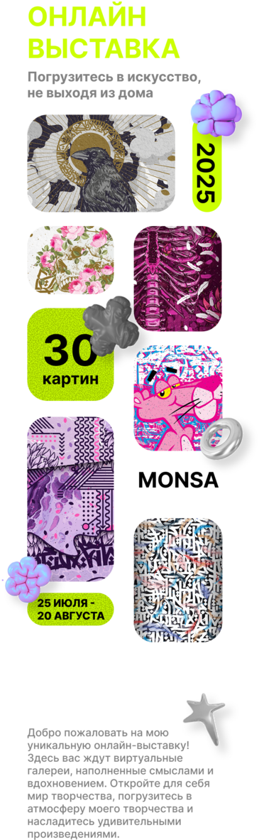 Добро пожаловать на мою уникальную онлайн-выставку! Здесь вас ждут виртуальные галереи, наполненные смыслами и вдохновением. Откройте для себя мир творчества, погрузитесь